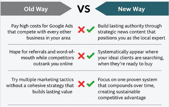 Take the step-by-step process I laid out here, study successful local businesses in your market, and try to figure it out on your own. Authority building isn't brand new - businesses have been establishing expertise for decades. There's no "secret."I've just figured out a systematic way to build local authority through strategic news content and promote it in a way that works with today's search algorithms and buyer behavior.